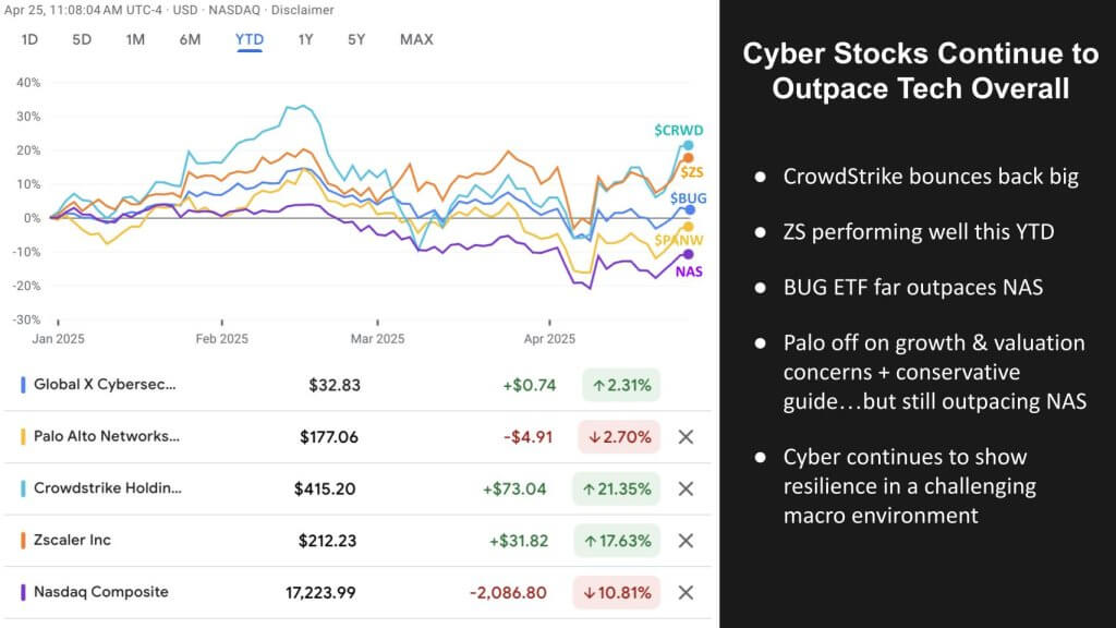 Below is a chart comparing year-to-date returns of leading cyber equities against the Nasdaq. The chart illustrates cyber’s resilience and relative strength in 2025. CrowdStrike is very strong and shows a bounce back from last summer’s July 19 incident, leading this pack on year-to-date gains. Zscaler shows very solid performance through April. The BUG ETF, which is one of our favorite cybersecurity baskets (along with CIBR), significantly outperforms the Nasdaq. Palo Alto Networks is under pressure because of growth and valuation concerns and what investors perceived as tepid guidance this quarter, yet it still is outperforming broader tech.