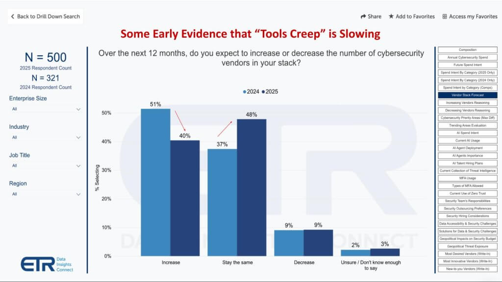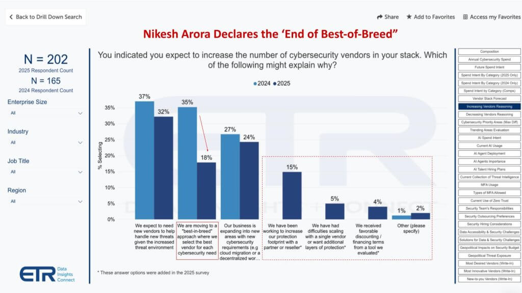 We’re not ready to declare BoB dead. However, the substantial reduction in self-declared best-of-breed strategies — from roughly one-third to less than one-fifth of respondents — adds weight to the platform-and-partner consolidation narrative. We believe the ultimate winners will be vendors (and managed security service providers) that demonstrate more facile integration, unified policy management, and AI-enabled correlation across domains — delivering security outcomes that match or exceed what a DIY mosaic of point tools once promised.