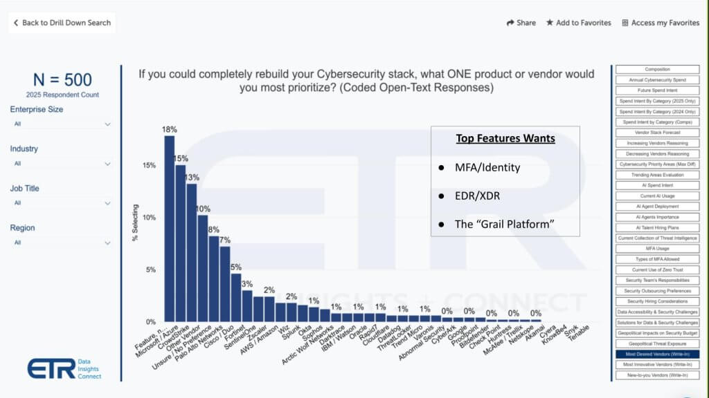 Platform > point tool. The fact that the No. 1 “vendor” is actually a feature set underscores a shift away from brand loyalty toward outcome-centric purchasing. Identity, MFA and unified XDR platforms are viewed as the structural foundation of a modern stack.