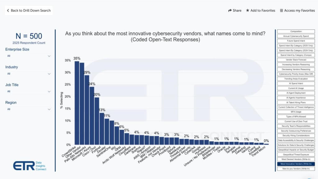 Perception and spend intent diverge. CrowdStrike tops innovation mindshare even as 10% of respondents still signal potential replacement — suggesting efficacy and great product trump recent operational missteps.