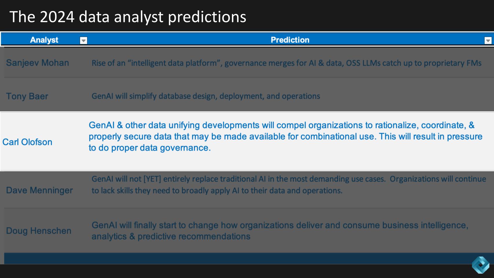 Carl Olofson’s 2024 prediction is shown below. He predicts that gen AI and other developments will catalyze a rationalization of data silos to enable combinatorial data use cases which will ultimately create governance challenges. So while some may see this as obvious, we asked if Carl is predicting organizations will be able to succeed in 2024, or will this governance challenge create insurmountable barriers to positive outcomes?