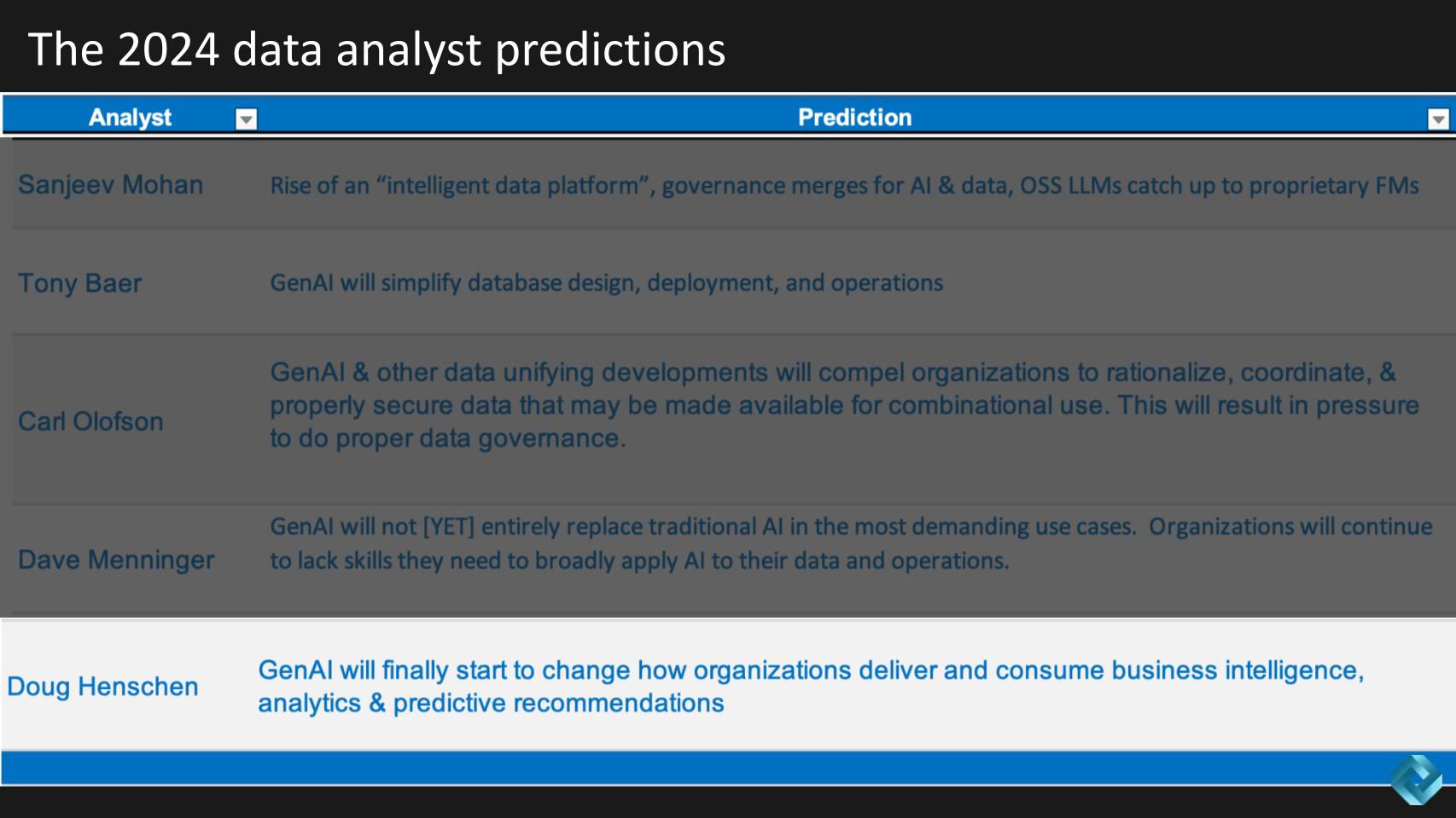 The last prediction comes from Doug Henschen, who is predicting that gen AI will have a material impact on how organizations approach BI and predictive analytics. Doug’s prediction has big implications for data analysts, data pros working in the pipeline, Tableau jocks and business end-users. We wanted to know from Doug if he’s predicting that we’ll see a measurable transformation before the end of the year.