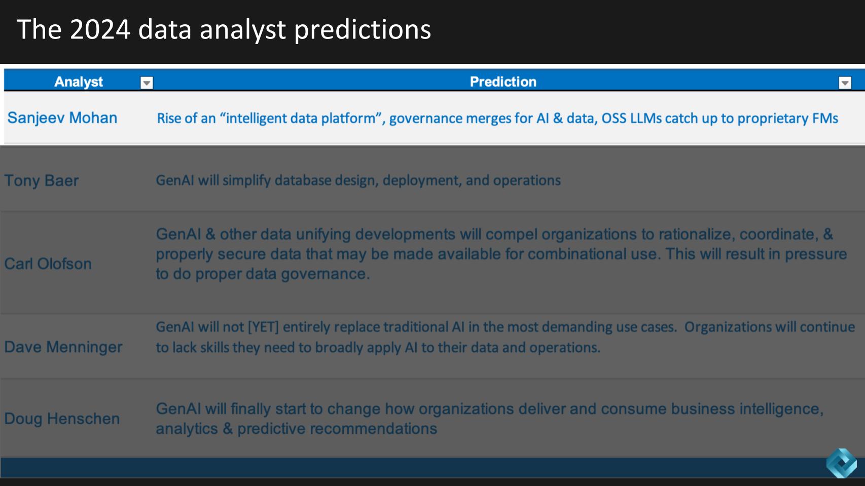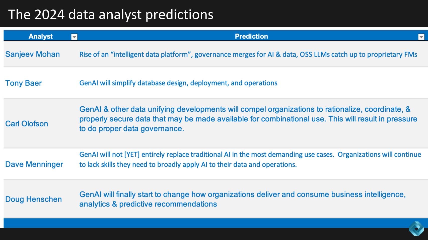 Below we show a table of all the predictions for 2024. All of them have AI included, but the forecasts span new data platforms, governance, metadata, database, skills gaps and more, so let’s get into it.