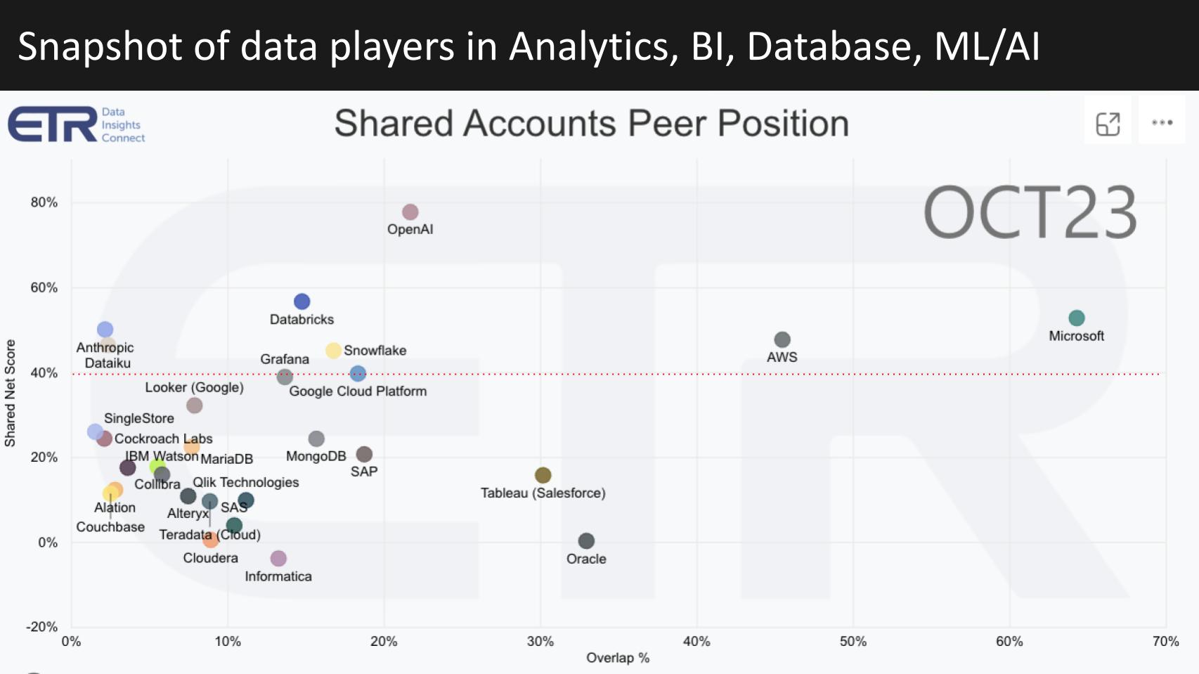 A couple of quick points include: 1) the presence of Microsoft Corp. and Amazon Web Services Inc. in these combined sectors is notable and well ahead of Google Cloud; 2) the momentum of OpenAI, at a Net Score of nearly 80%, is astoundingly impressive and its presence on the X axis represents about seven times the account penetration of Anthropic PBC, which you see on the lefthand side of this chart just above Dataiku Inc.; 3) Snowflake Inc. and Databricks Inc. remain above the 40% mark with strong momentum and 4) you can see a number of companies that we’ll discuss directly and indirectly across this graphic in the basket of sectors, including MongoDB Inc., SAP SE, IBM Watson, as well as governance, metadata, pipeline and extract/transform/load tools such as Informatica Inc., Collibra NV, Alation Inc., Alteryx Inc. and others. There are also business intelligence platforms such as Thoughtspot Inc., QlikTech International AB, Tableau and Looker, and of course a number of database and data analytic platforms such as Couchbase Inc., Cloudera Inc., SAS Institute Inc. and notably Oracle Corp. and SAP.