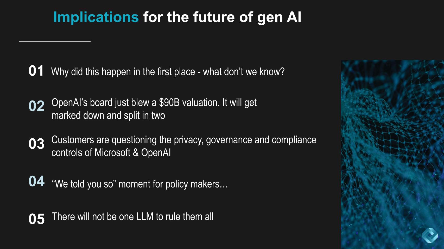 This raises a credibility issue for Microsoft. If you’re a customer, you’re going to take pause and question this disaster. If Microsoft essentially ignored the governance risks on a potentially $13 billion investment, and OpenAI has a completely dysfunctional board and structure, would you trust them with your data and potentially the future technology roadmap of your company?