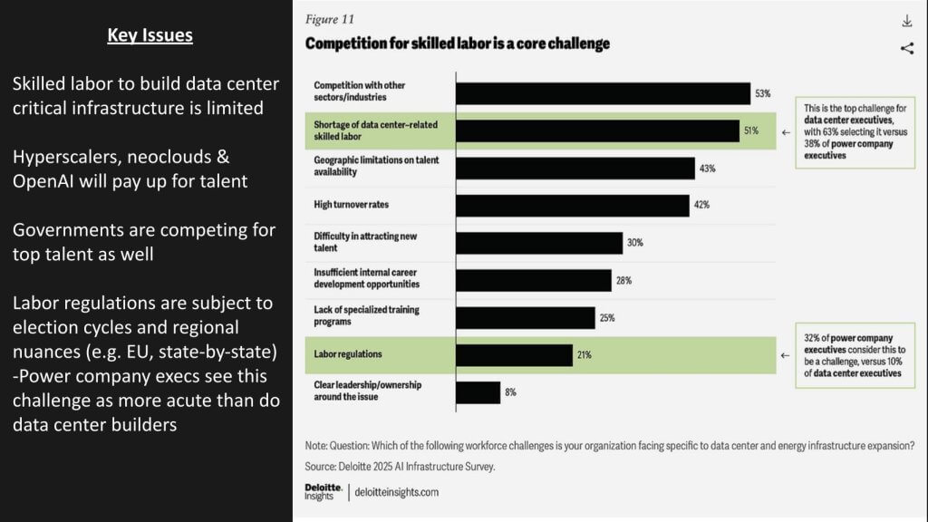 The Deloitte study lays out many challenges and solutions to building out AI infrastructure. Perhaps one that is most underappreciated is skilled labor. We believe a key blocker after power is people.