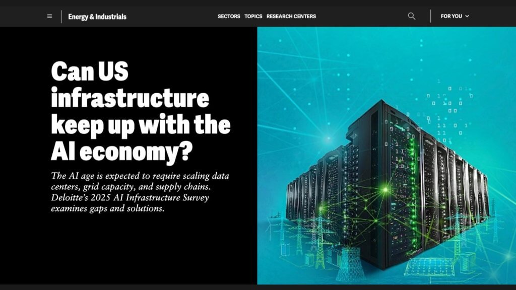 We believe Deloitte’s “Can US infrastructure keep up with the AI economy?” report articulates a central constraint to our thesis: Energy and water availability – and the speed of grid expansion – will set the pace of the buildout.