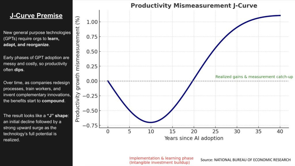 This fresh information gives us an opportunity to revisit our figures and do so in the context of economist Erik Brynjolfsson’s productivity J-curve, which explains why new general purpose technologies, like electricity, the steam engine, computing and AI, often experience limited productivity growth at first, because organizations must learn, adapt and reorganize in order to realize benefits. Over time, these innovations tend to outperform expectations.